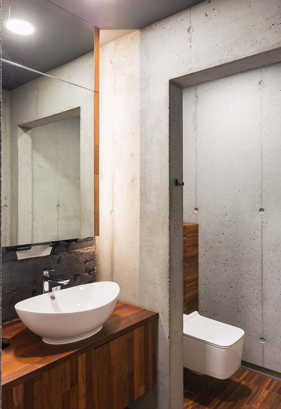 Kluczowym elementem kompozycyjnym stał się centralnie usytuowany filar żelbetowy, który pełni funkcję wielozadaniowego rdzenia lokalu. Zintegrowano w nim m.in. bar, zaplecze sanitarne, pionowy szyb serwisowy oraz elementy zieleni. Takie rozwiązanie pozwoliło na czytelny podział funkcji i płynną komunikację pomiędzy strefami – barem drinkowym i sushi, salą restauracyjną oraz stolikami przy oknach.