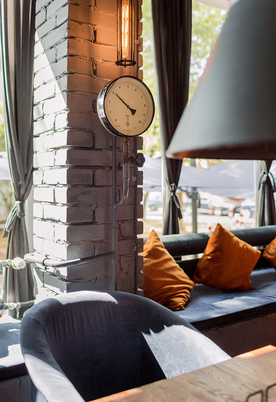 Materiały użyte w restauracji dobrano na zasadzie kontrastów. Surowe elementy konstrukcyjne z betonu i stali zestawiono z naturalną drewnianą podłogą oraz drewnianymi meblami. Szklane elementy, odnowione metalowe lampy, żebrowane grzejniki i aneroidowe barometry kontrastują z aksamitnymi fotelami i zasłonami, tworząc równowagę pomiędzy surowością a miękkością wnętrza.