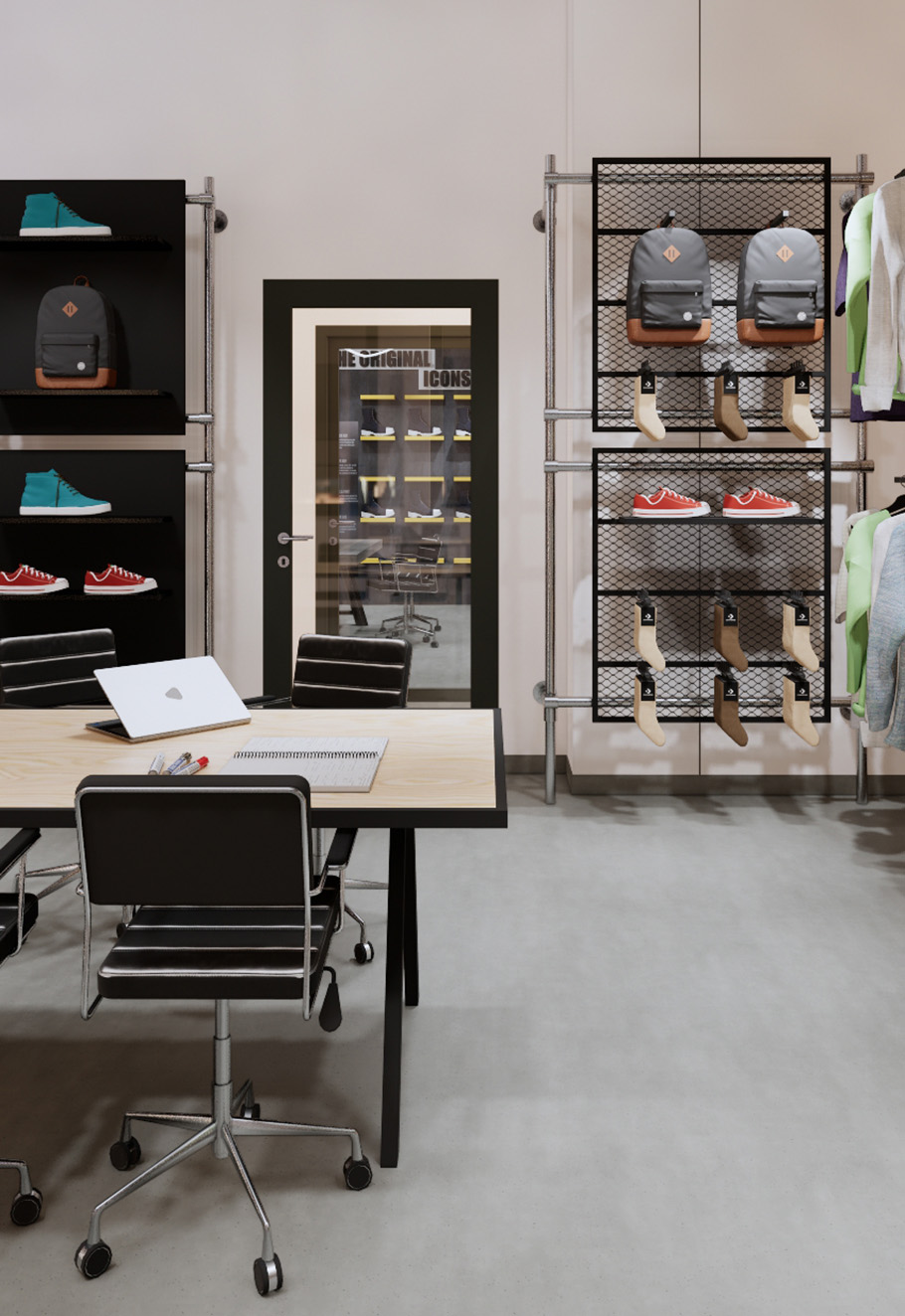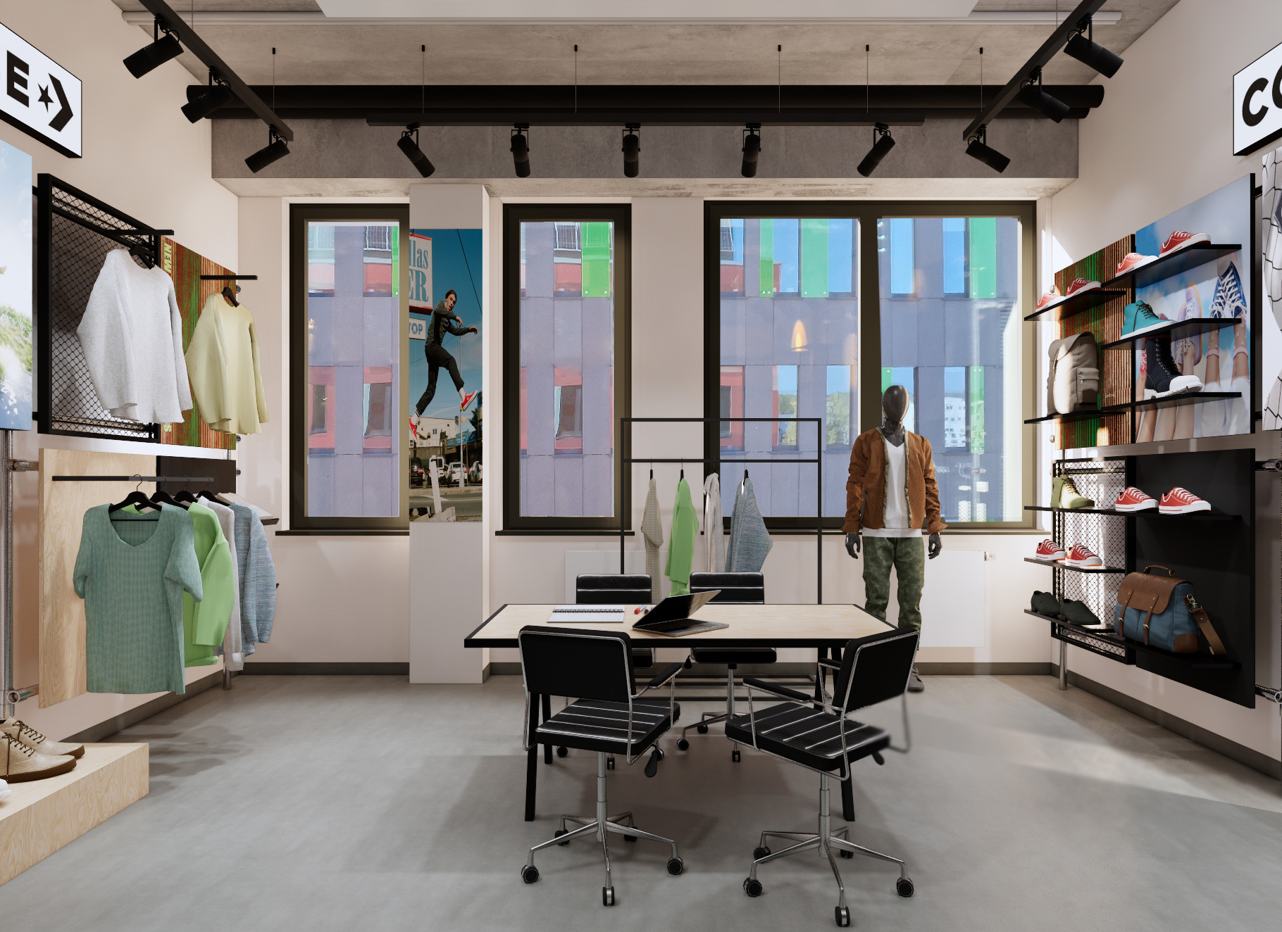 Showroom marki Converse, o powierzchni 28 m², został zaprojektowany zgodnie z globalnym wizerunkiem marki, który wyróżnia się industrialnym, miejskim stylem. Meble wykonano z rurek i elementów budowlanych, takich jak sklejka, czarna blacha i panele z siatki cięto-ciągnionej, co nadaje przestrzeni surowy, streetowy klimat, idealnie odzwierciedlający ducha Converse.