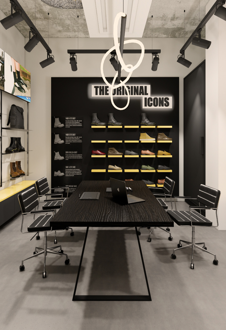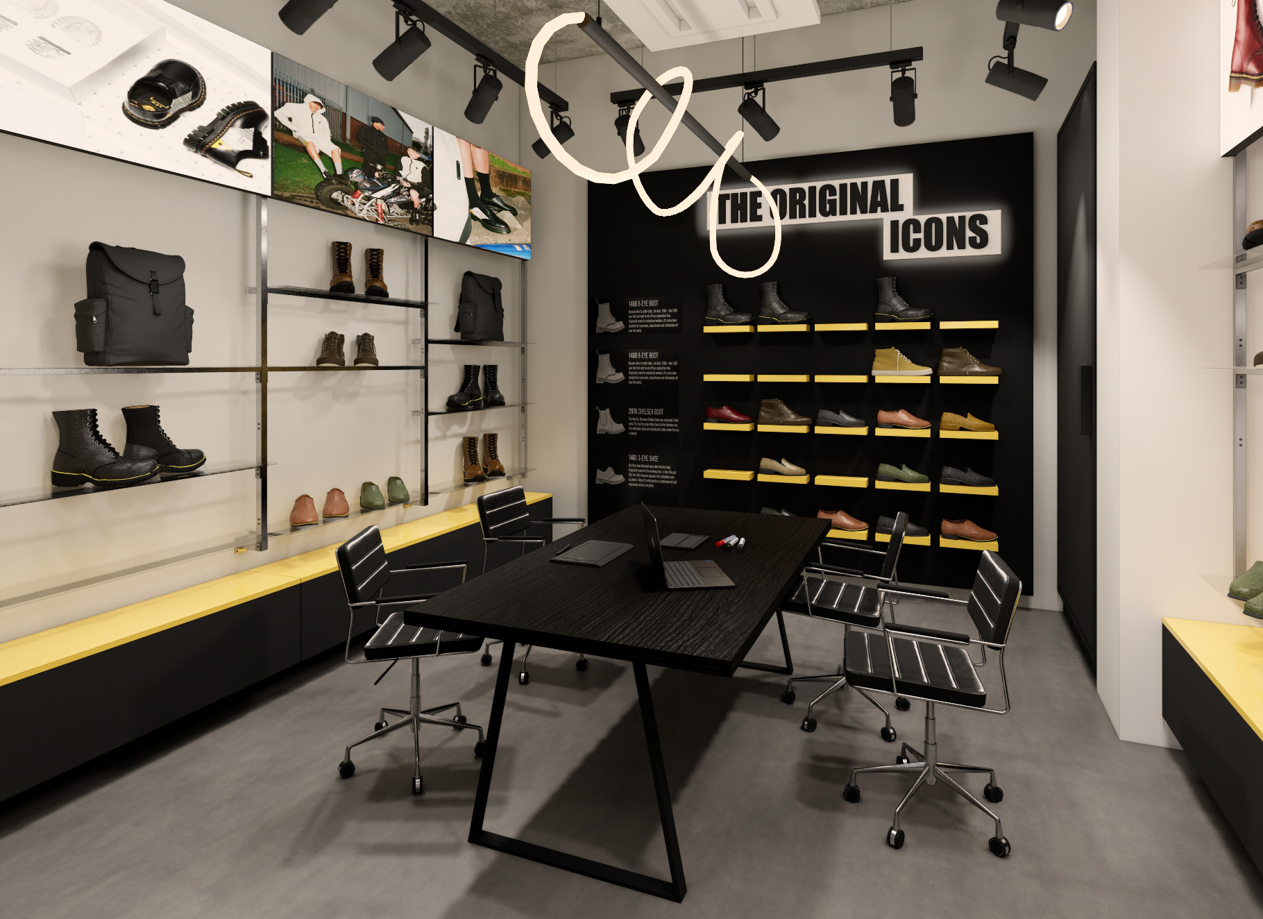 Showroom Dr. Martens, o powierzchni 20 m², również wiernie odtwarza estetykę globalnego projektu marki. Meble wykonano z profili ze stali nierdzewnej szczotkowanej, z możliwością elastycznego rozmieszczenia szklanych półek. Centralnym punktem jest ikoniczny mebel THE ORIGINAL ICONS, a nad stołem zawieszono unikalną lampę z elastycznego profilu LED. Dodatkowo, na górze mebli zamontowano 9 monitorów LCD, wyświetlających markowe treści, które wzmacniają identyfikację wizualną.