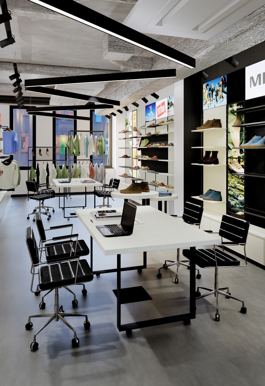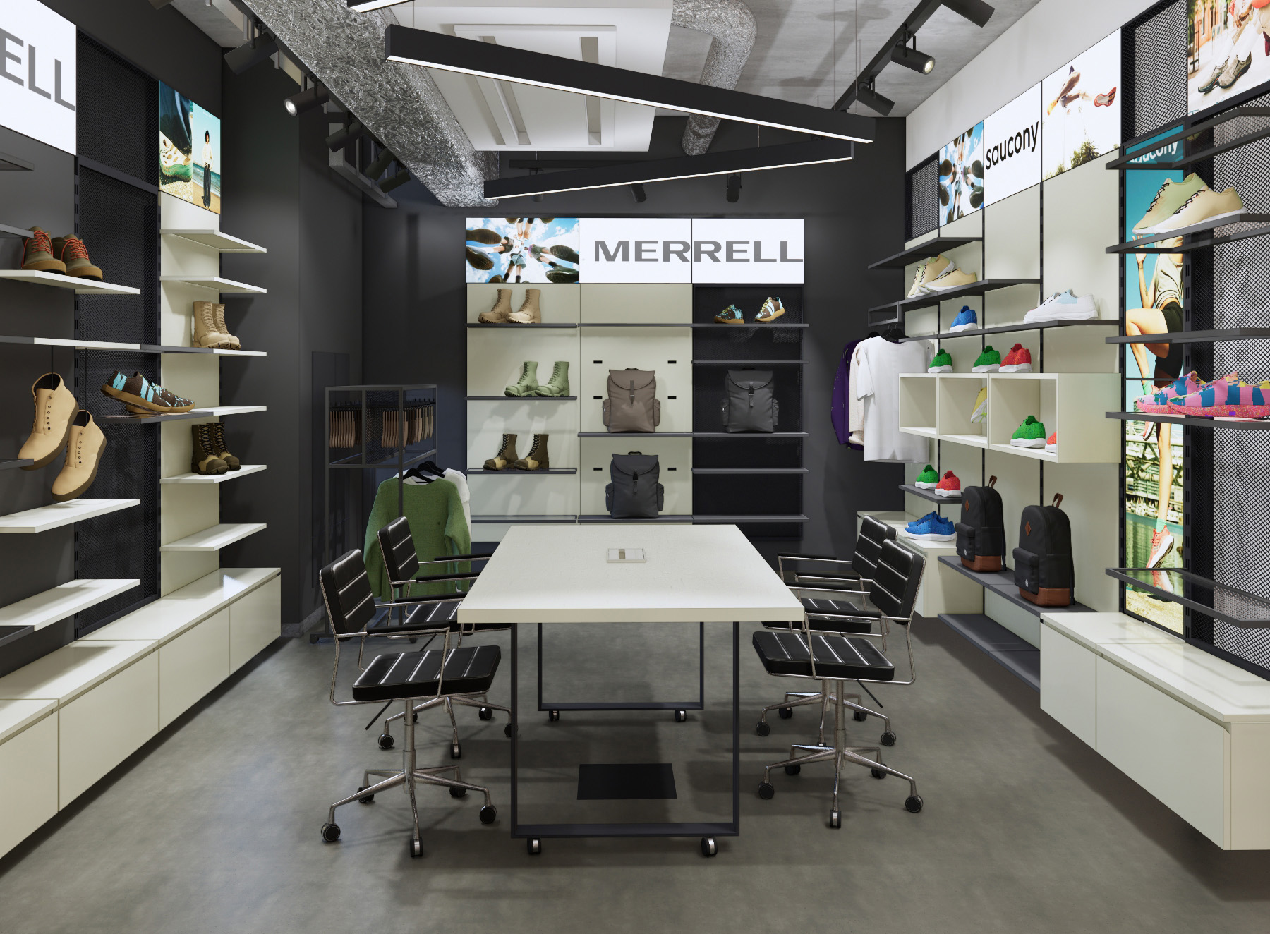 Showroom multibrand, największa przestrzeń o powierzchni 53 m², przeznaczona jest dla marek CAT, Fit Flop, Merrell, Saucony oraz K-Way. Wszystkie ściany wyposażono w stalowe meble w kolorze grafitowym, z półkami umożliwiającymi elastyczne i dowolne układanie dzięki perforowanym słupkom stalowym. Dolne poziomy szafek stanowią szuflady z lakierowanego MDF w kolorze jasnym beżowym. W pomieszczeniu znajduje się 28 monitorów LCD, wyświetlających grafiki. Blaty stołów wykonano z lakierowanego na jasny krem forniru dębowego. Głównym wyzwaniem było zaprojektowanie mebli mieszczących 300 butów z możliwością zmiany półek. Dodatkowe estetyczne elementy to siatki cięto-ciągnione między przęsłami oraz panele MDF lakierowane na kolor jasny beżowy. Stoły i meble wolnostojące, w tym fotele, zaprojektowano na kółkach, aby umożliwić łatwą zmianę aranżacji.